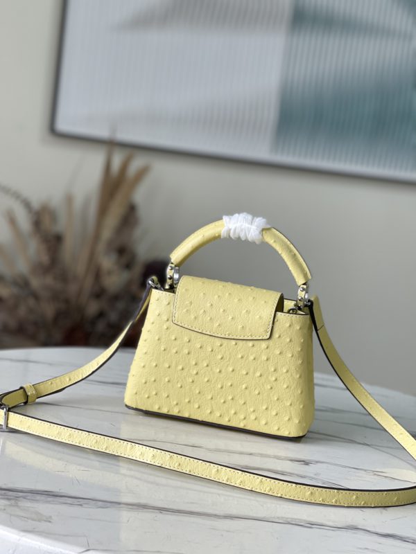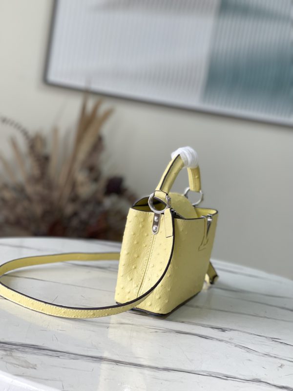 Yellow ostrich leather mini Capucines ostrich leather handbag, moderate hardness handle, gorgeous buckle connecting the handle, spacious and practical shape, etc. The drop cover can be used in two ways, and it can be placed outside the bag to show the fashion trend of the Monogram flower pattern.