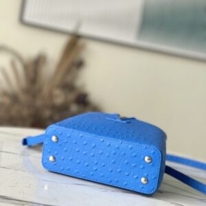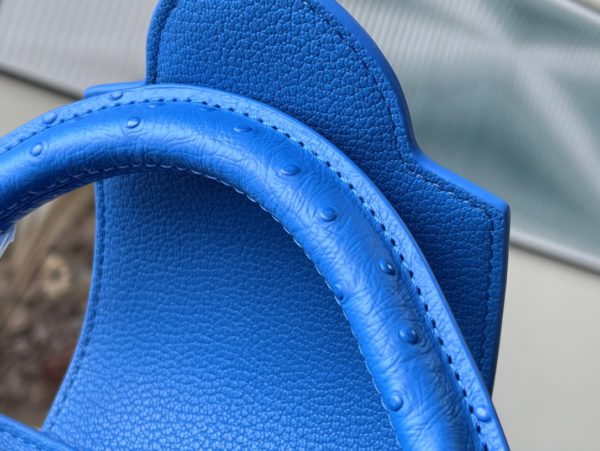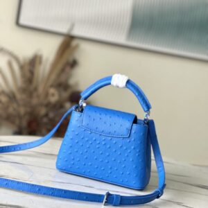 Blue ostrich leather mini Capucines ostrich leather handbag, moderate hardness handle, gorgeous buckle connecting the handle, and spacious and practical shape, etc. The drop cover can be used in two ways, and it can be placed outside the bag to show the fashion trend of the Monogram flower pattern.