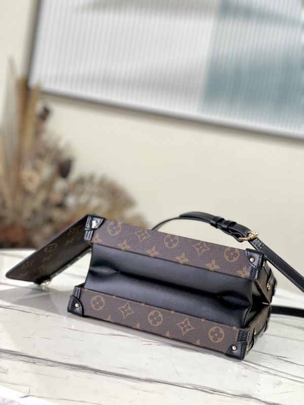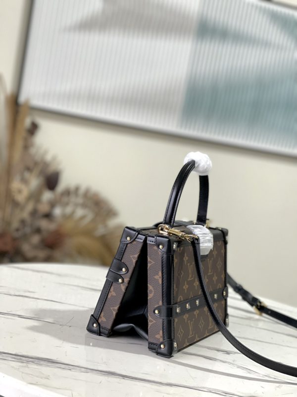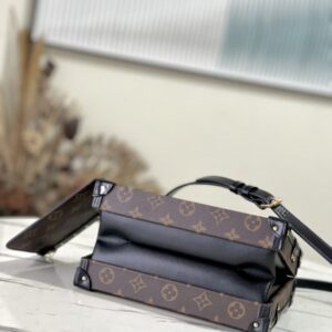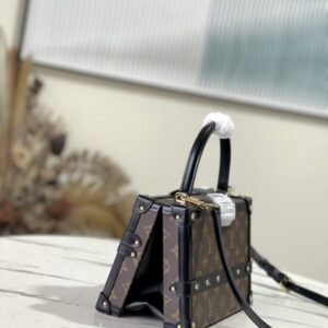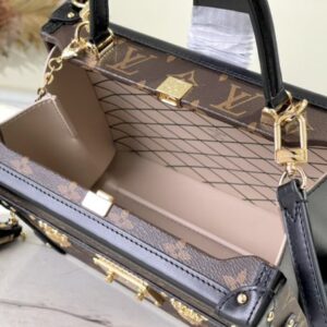 Nicolas Ghesquières went back to Louis Vuitton’s tradition of making boxes again to create this Petite Malle V handbag. Monogram canvas with leather trim and V-shaped side gussets for softness and roominess. Attached Monogram zipped interior pocket secured with a chain.
