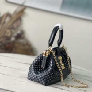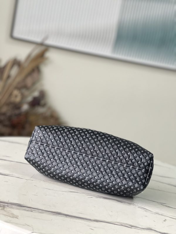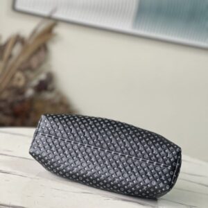 Black from the Nanogram Special Collection Monogram Clutch bag in soft calfskin, embossed with the Monogram in odd proportions, with a slightly two-tone effect. The swivel handle joint folds inside the bag, transforming the bag into an elegant clutch.