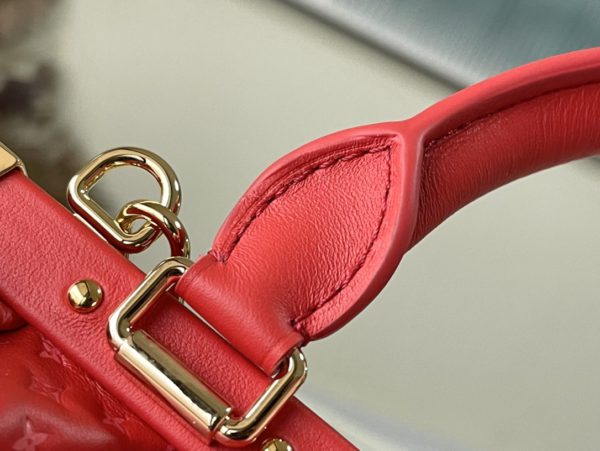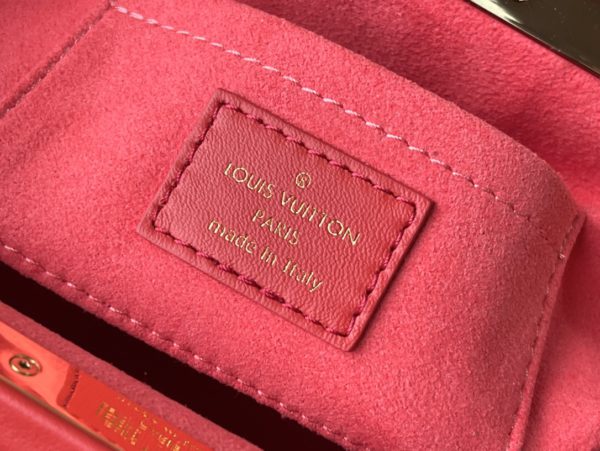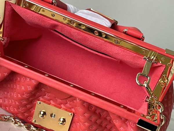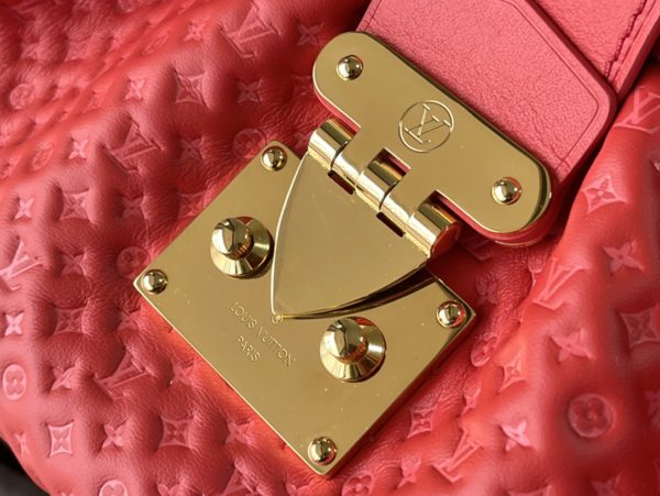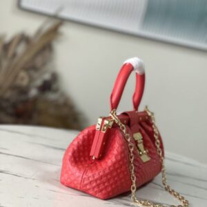 Carmine Monogram Clutch Bag from Nanogram Special Collection in soft calfskin, embossed with Monogram in odd proportions, with a slightly two-tone effect. The swivel handle joint folds inside the bag, transforming the bag into an elegant clutch.