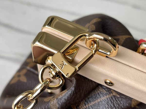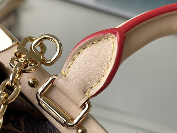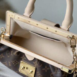 Monogram Clutch handbags are made of Monogram canvas with cow leather trim and classic S-lock locks, rivet buckles, metal corners, and other metal parts. It’s topped with a rolled leather top handle and features a detachable chain and retractable swivel joint.