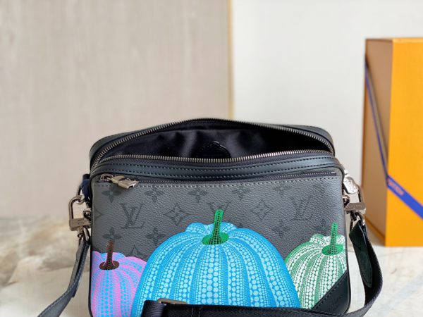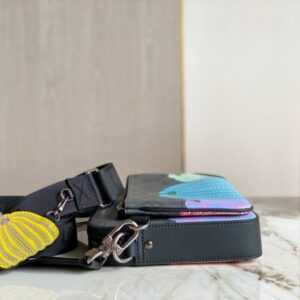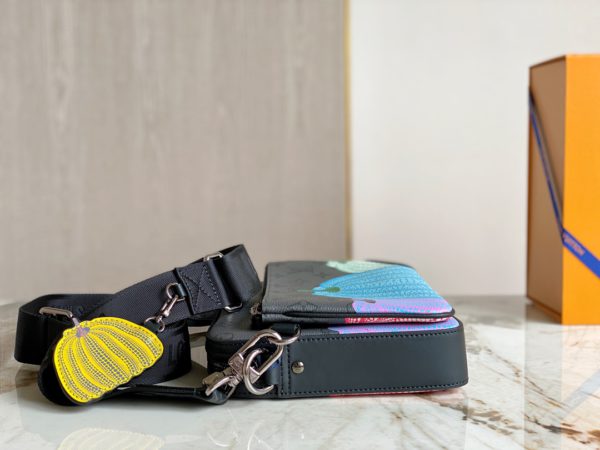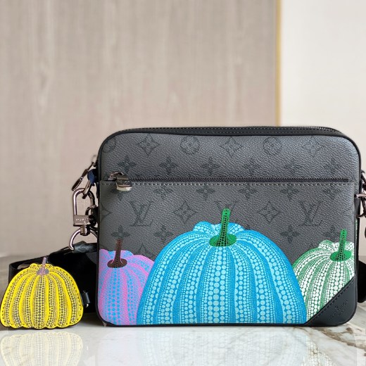 Silk screen men’s bag mobile phone case series LV x YK Trio messenger bag M69443 from Louis Vuitton x Yayoi Kusama cooperation series made of Monogram Eclipse canvas and Monogram Eclipse Reverse canvas. A signature tonal pattern accentuates the lines of this versatile building design. In addition to the functions of a traditional cross-body handbag, it is also equipped with a detachable zipper pocket and a coin purse attached to the strap.