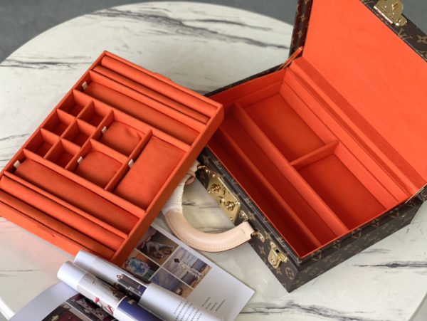 This Monogram jewelry case is especially suitable for carrying precious items when traveling. There are thirteen compartments of different sizes, which are opened and closed by S lock and two suitcase mortise locks. This product is expected to arrive in more than three months.