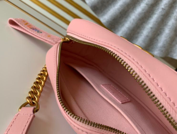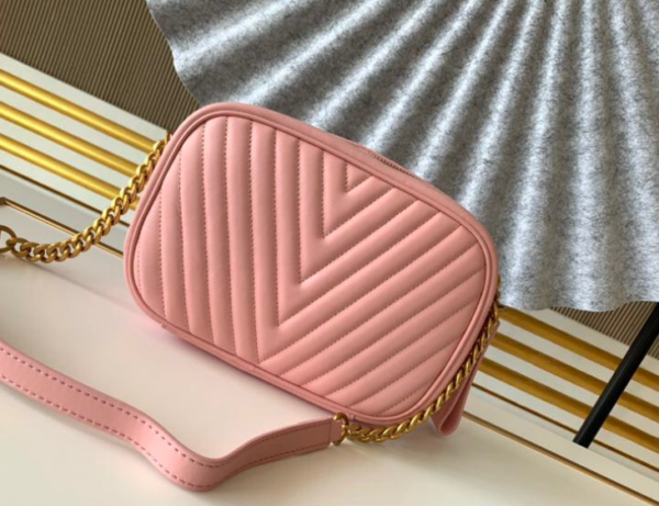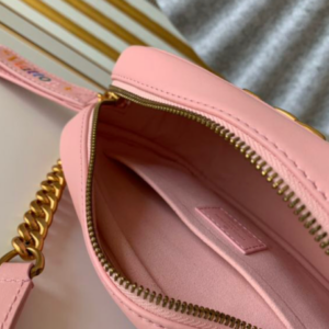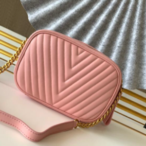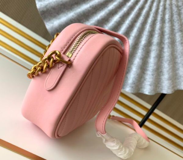 The New Wave camera bag in quilted calfskin to welcome the spring and summer of 2019. Retro gold lettering embellishes the personalized structure, and colorful branding outlines the modern lines of the New Wave quilted leather zipper puller. Comes with a leather and chain shoulder strap for a comfortable shoulder or cross-body carry experience.
