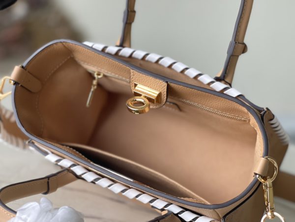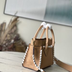 Apricot full leather woven series This On My Side small handbag is made of calf leather, with Monogram perforated calf leather to shape the structure on both sides. External pockets provide easy access to items, while the top handle and detachable shoulder strap allow shoulder and cross-body options.