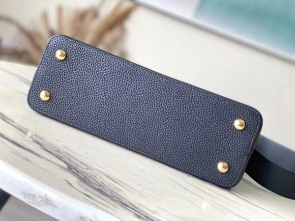 Ostrich pattern small Capucines handbag is made of Taurillon leather to create an exquisite shape, and the flap, handle and LV letters are wrapped in ostrich leather. The flip cover can be opened or closed to read the LV logo, and the detachable wide leather shoulder strap is full of modern style.