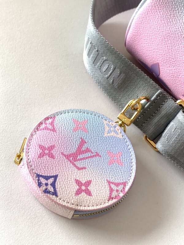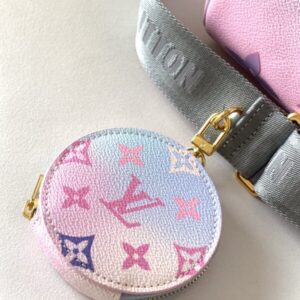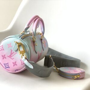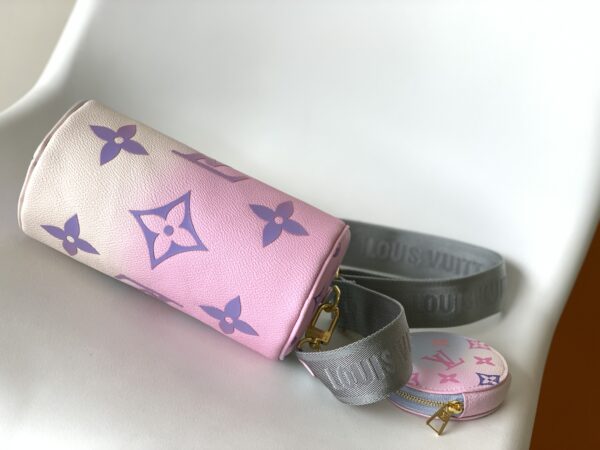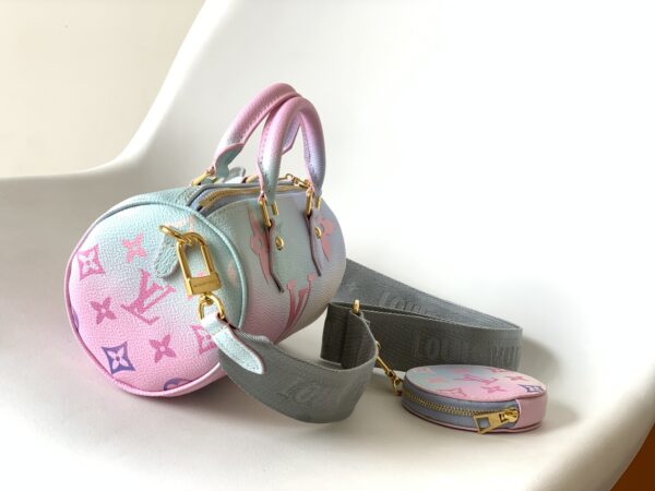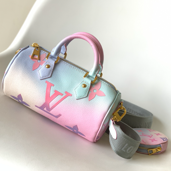 This Papillon BB handbag enlarges the classic pattern of Monogram canvas to render it Spring new gradient color detachable wide jacquard shoulder strap hanging round coin purse can also use the classic Toron handle to achieve formal portable styling.