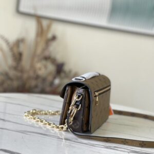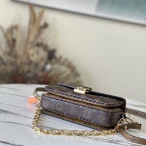 Yellow flower Pochette Métis East West handbag is made of Monogram canvas, calfskin trim and S-lock buckle. It continues the classic elements and has modern details such as a short chain on the shoulder. The roomy shape features compartments, interior zip pockets, and exterior pockets to easily store your iPhone 13.