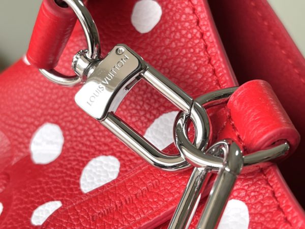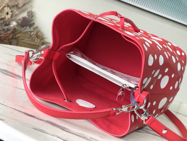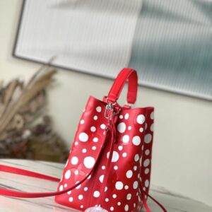 Top layer leather red dot LV x YK NéoNoé BB handbag from x Yayoi Kusama cooperation series, condensing the creative energy of the infinite wave point world. Monogram embossed calfskin reflects Yayoi Kusama’s signature polka dots, and the detachable pumpkin-shaped decoration adds to the artist’s visual calling card.