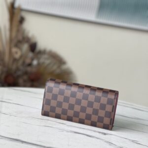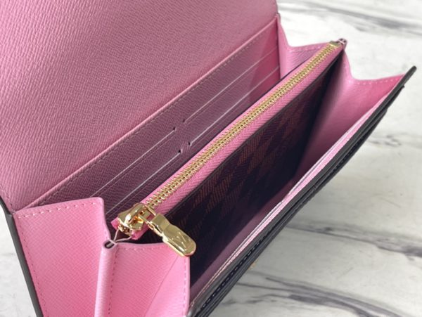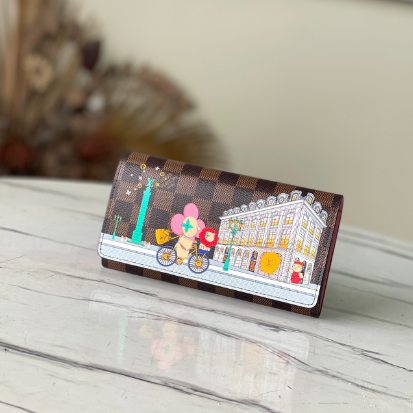 This Sarah wallet is made of Damier Ebene canvas and reinterpreted in the Vivienne Holidays 2022 series, highlighting the spirit of travel. The limited-edition print on the wallet pays homage to Paris with a colorful scene as Vivienne, the Louis Vuitton mascot, cycles past the store in Place Vendome. This elegant collector’s edition flap wallet is lined in pink leather, making it the perfect gift.