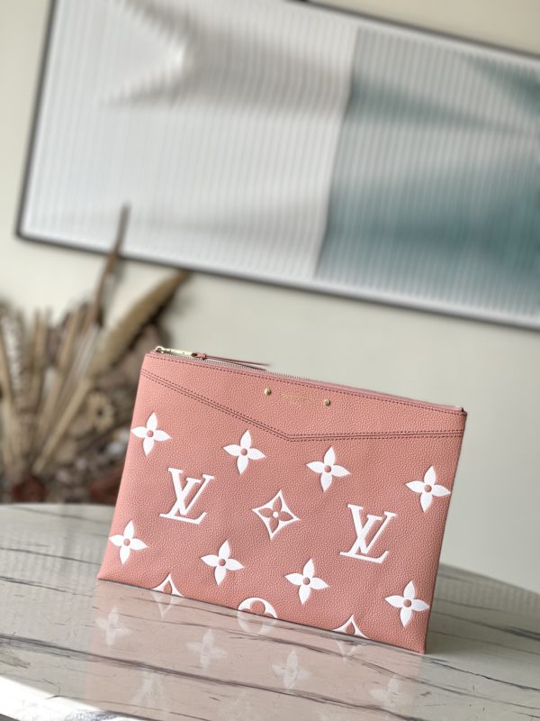 Pink Silkscreen Daily Clutch is Monogram Empreinte soft grain leather embossed with the classic Monogram pattern, complemented by a modern texture with a two-tone effect. Fits in a large tote while holding business essentials like documents and a tablet.