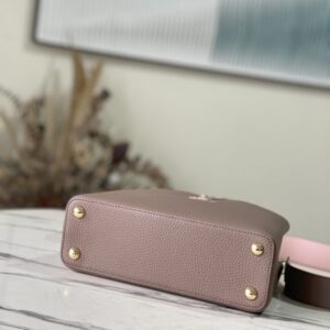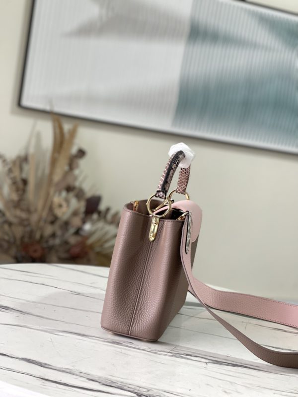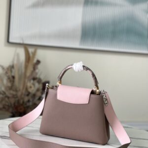 Small CAPUCINES handbags with color matching and python gold buckle Spring Capucines BB handbags are dipped in soft tones, and the handle and logo release the exotic charm of python skin. The wide, detachable shoulder strap and top handle allow for versatile carrying options, day or night.