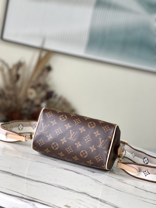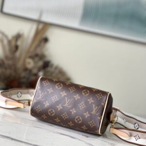 Inspired by classic travel bags, this Speedy Bandoulière 20 features Monogram canvas and calfskin trim with rolled leather handles, padlock and key case. The brand logo is embellished with a detachable shoulder strap, which can be switched over the shoulder and crossbody at will.