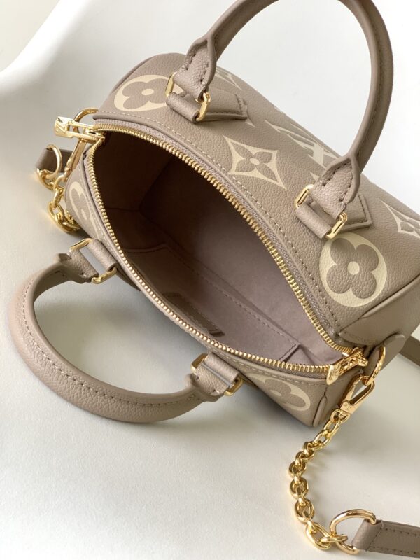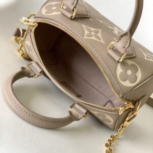 Monogram Empreinte leather, decorated with LV logo and Monogram floral pattern, this Speedy Bandoulière 20 handbag is a modern classic. The design is inspired by the Speedy suitcase series of the 1930s, with original shape and articulated handle. Comes with a leather metal chain strap for easy shoulder and crossbody carry.