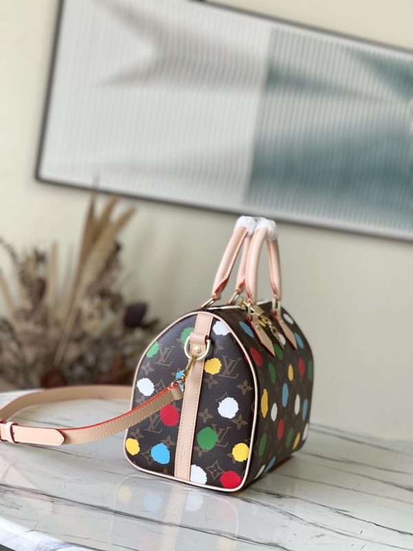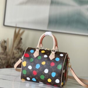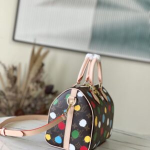 Speedy Bandoulière 25 handbags from the x Yayoi Kusama collaboration series, witnessing the integration of artistic creativity and exquisite craftsmanship. Japanese artist Yayoi Kusama’s iconic polka dots lay out the Monogram canvas, which presents a three-dimensional hand-painted texture through complicated silk screen printing techniques, injecting artistic thinking into urban design.