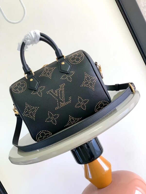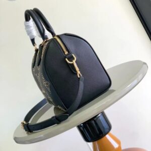 This charming Speedy Bandoulière 25 handbag uses gold studs to interpret the special edition Monogram pattern, adding a rock and roll aesthetic to the look. Inspired by the Louis Vuitton travel bag, the Speedy is a classic model of the brand, embellished with the original design’s two leather top handles and engraved padlock.