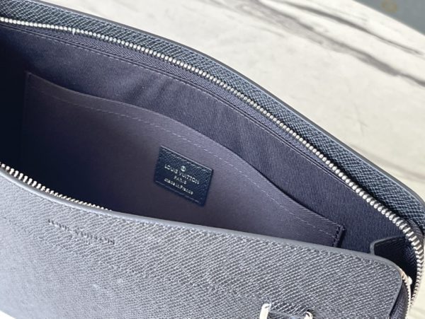 This Standing Pouch clutch is made of Taiga leather to create ample space, which can comfortably accommodate tablets, mobile phones and other small objects. The surface of the letters complements the texture of the body of the bag, and the detachable wrist strap is convenient for daily travel.