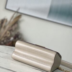 Elephant gray Twist handbags debuted at the 2015 Cruise early spring show and became a new classic of the brand. The Twist Medium Chain Bag is crafted from iconic Epi leather with an LV Twist lock in shiny metal. The wavy bottom cleverly builds ample space, and the sliding chain shoulder strap can be folded over the shoulder or unfolded across the body, making it easy to shine on day and night occasions.