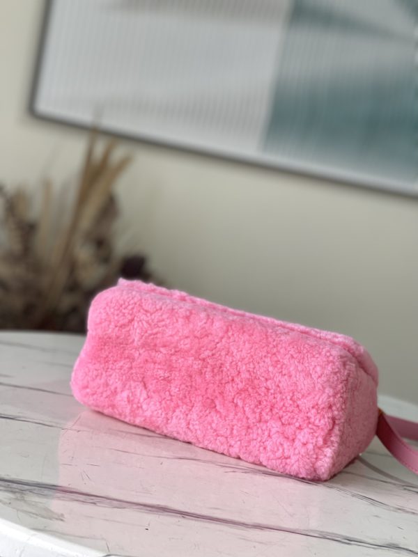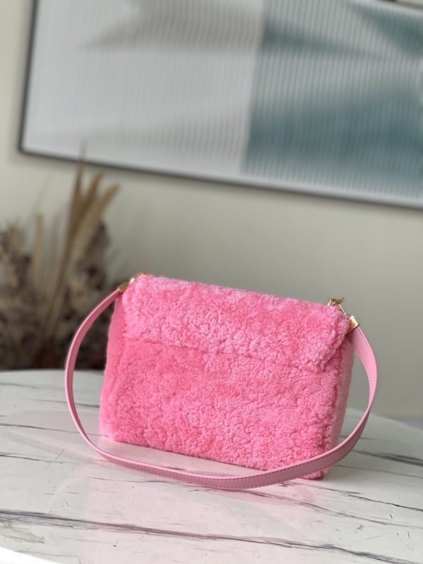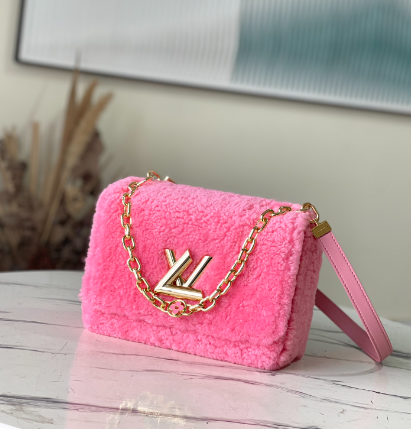 Pink plush TWIST medium handbag This Twist medium handbag focuses the eye in bright wool leather, and then embellishes the double chain with enamel Monogram flowers. Both the chain and leather shoulder straps are detachable, so you can switch between a variety of carrying methods.
