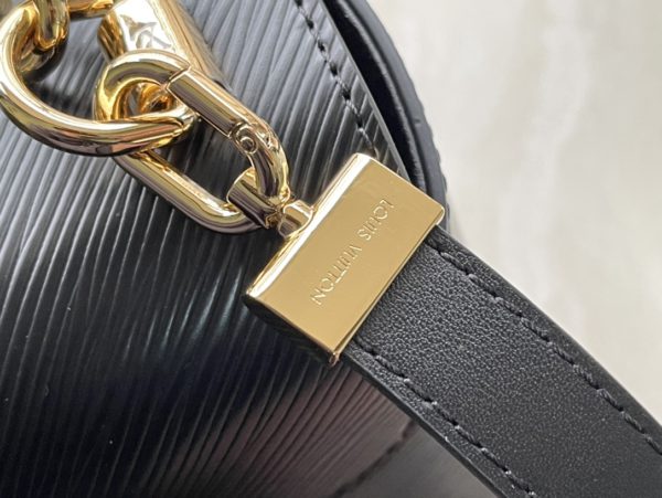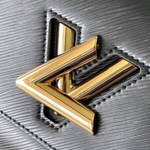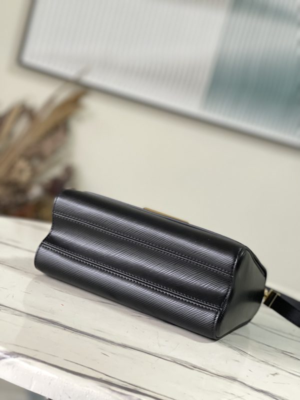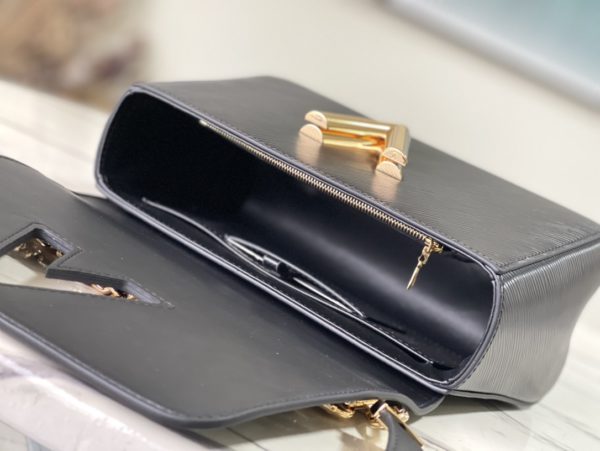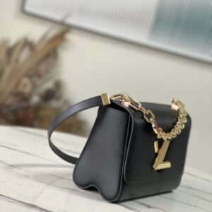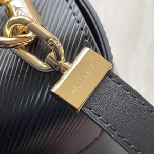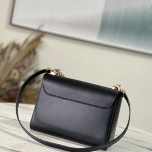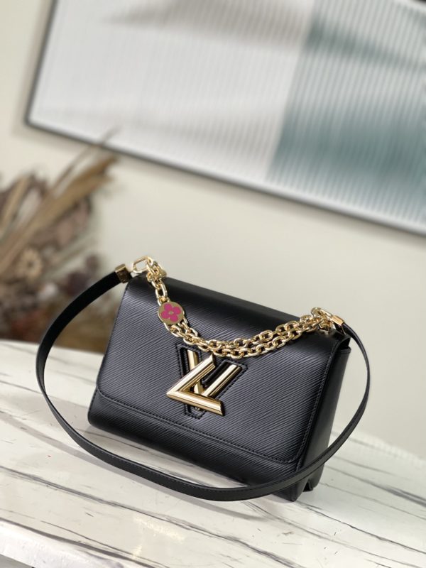 This Twist medium handbag incorporates an enamel Monogram flower into a double chain, which can be used as a delicate embellishment or connected to the shoulder strap for more styling possibilities. Epi grained leather body with smooth leather trim and lining.