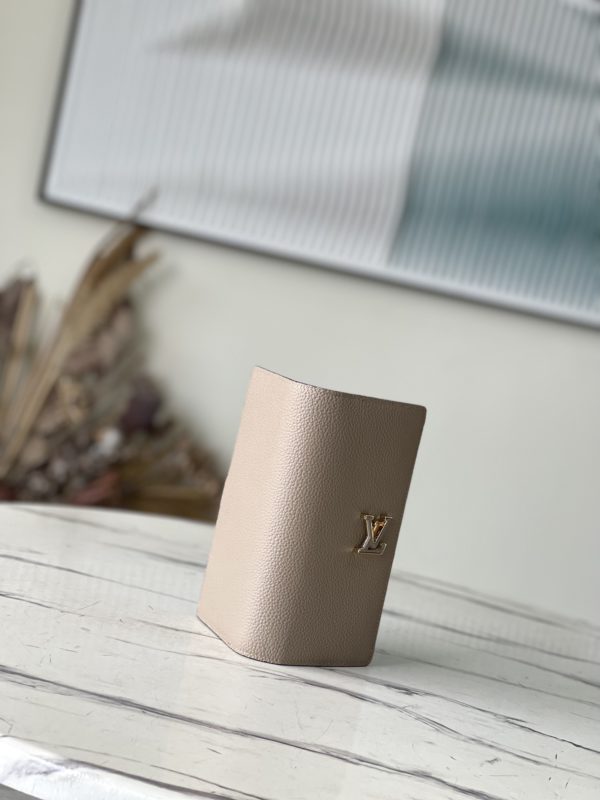 This LV Vertical wallet is made of soft grained Taurillon leather, with lettering for the sliding closure, inspired by the design of Capucines handbags. The pop-up contrast lining features a card slot, zipped coin pocket, and large V-shaped compartment for bills and receipts.