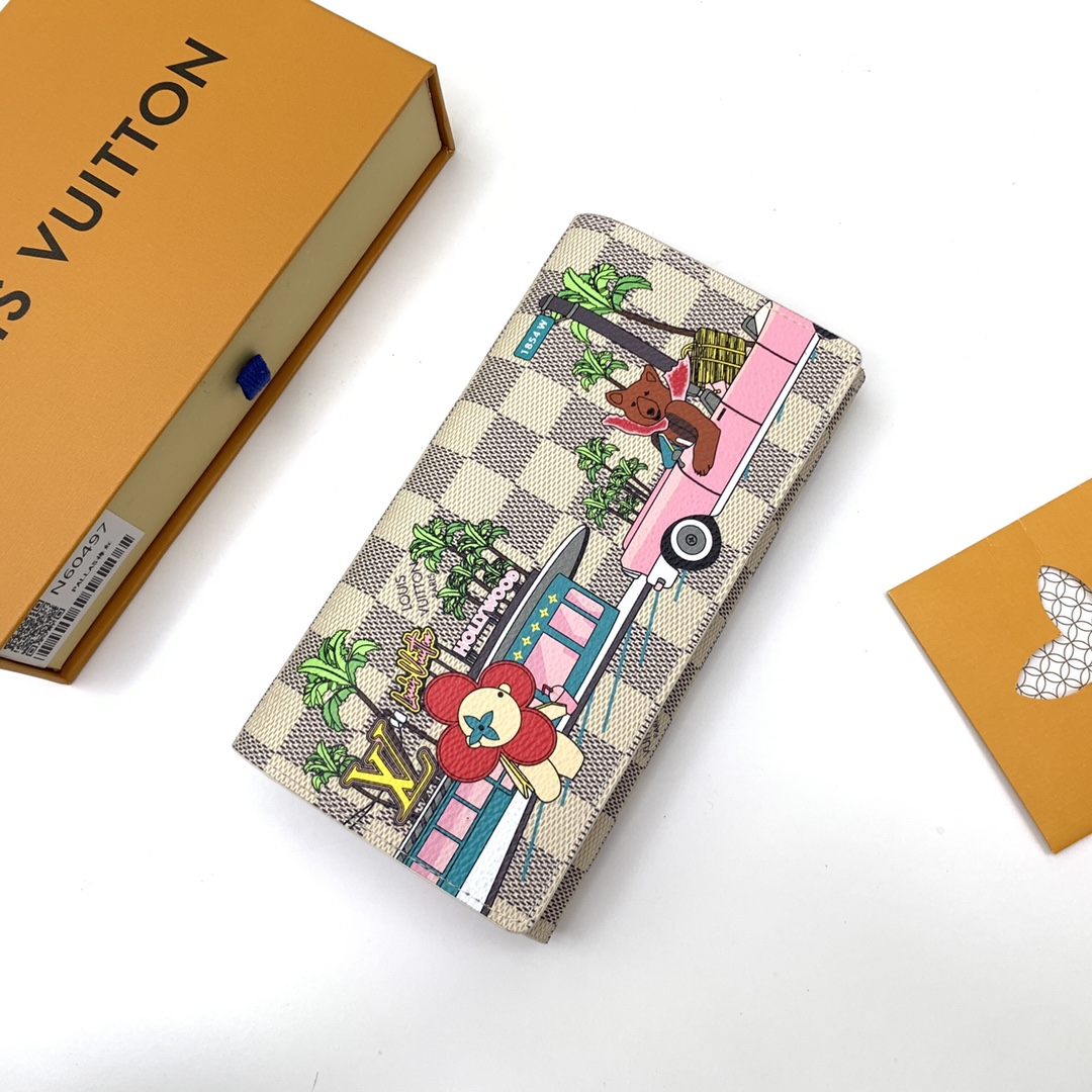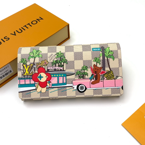 “Portofoy Sala” made of Damier Azul canvas and lined with Fuser pink leather. I designed playful prints that are perfect for the holiday season. Maison’s popular mascot “Vivian” standing in front of LV restaurant in Hollywood, watching the friendly California bear drive by. This is a long wallet that can be opened and closed with an Envelop type flap with a snap button.