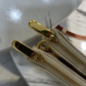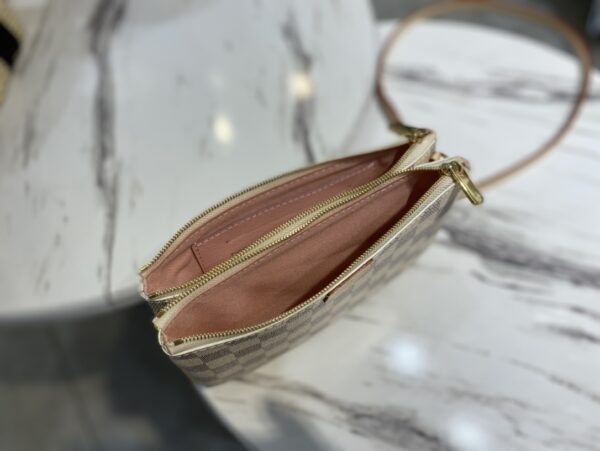 Double Zip Pochette handbag is made of Damier Azur canvas, with a detachable shoulder strap cut from Louis Vuitton’s classic natural cowhide. There is an open pocket in the center of the zipper bag, and the natural leather label is embossed with the brand logo.