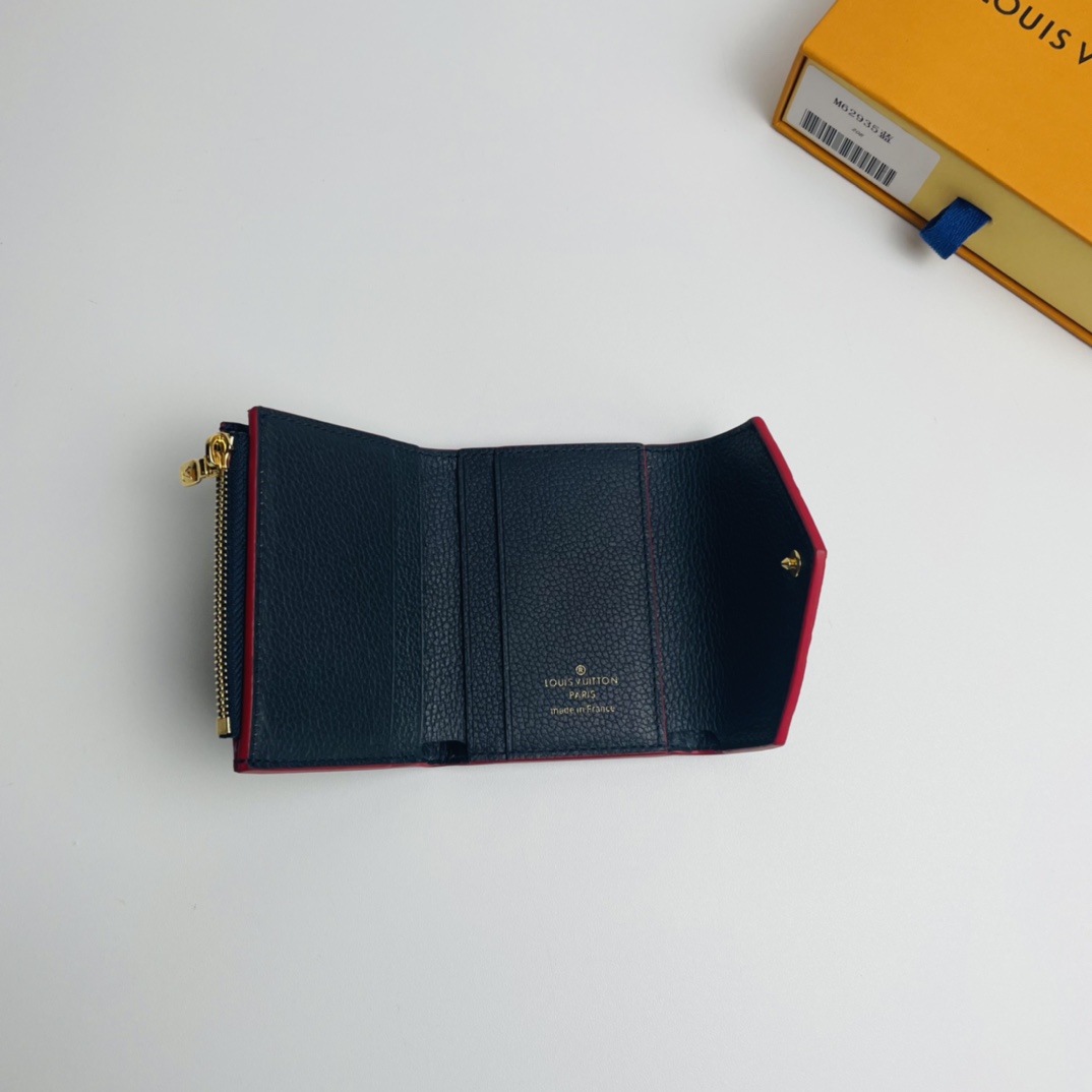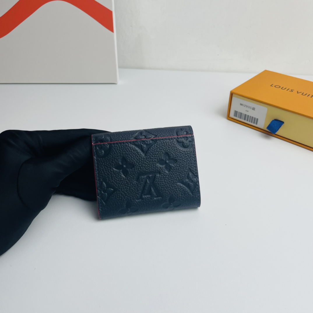 Zoe compact wallet in supple Monogram Empreinte grained leather embossed with the iconic Louis Vuitton Monogram. The size of any small bag is easy to store, enough to store coins, banknotes and credit cards, and it is a compact and mini portable accessory.