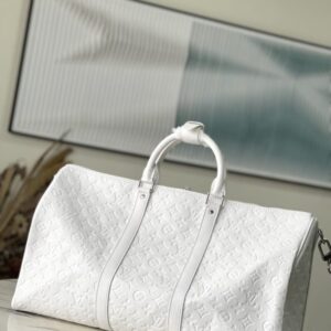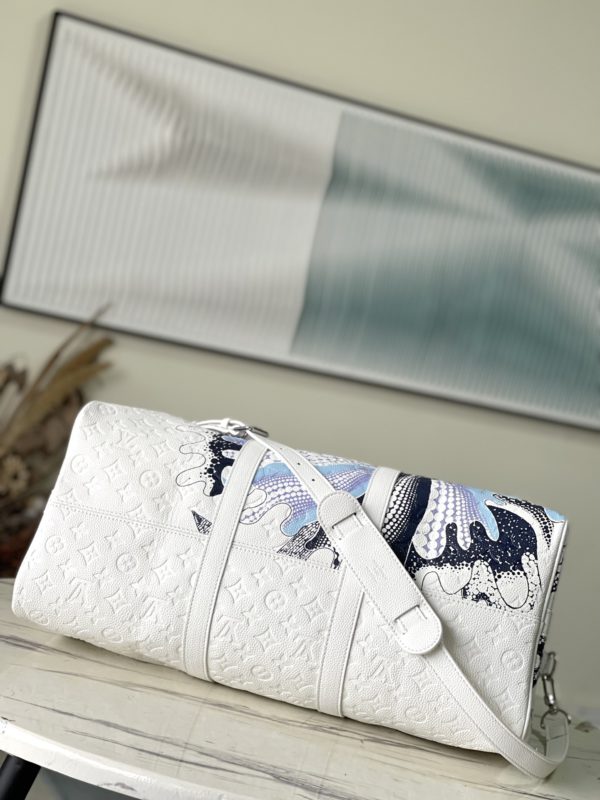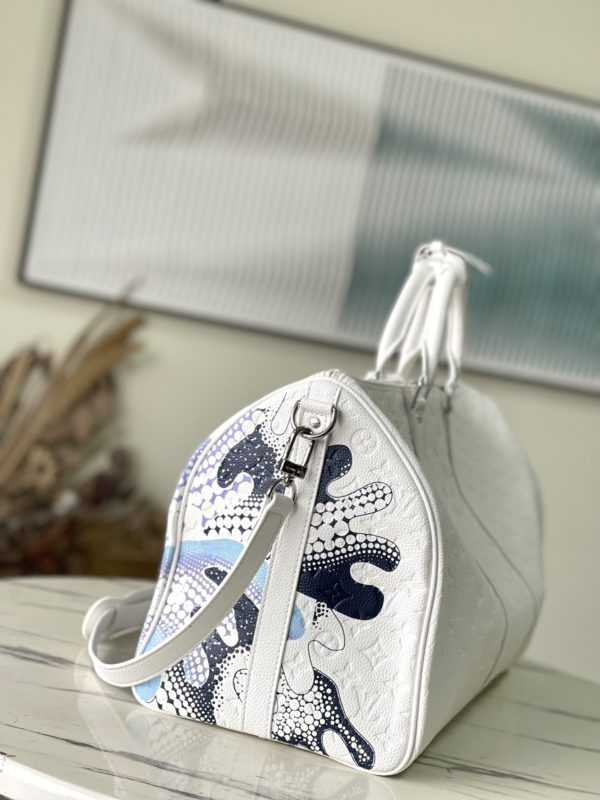 YK Keepall 50 travel bag from x Yayoi Kusama cooperation series. Thousands of polka dots intertwine to form a psychedelic flower outline, symbolizing the transience of life and the infinity of time, representing the well-known creative imagery of this Japanese artist. The x YK logo points out the identity of the series, making it another good collection.