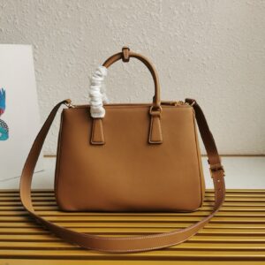 The sophisticated and timeless Prada Galleria bag combines industrial precision and refined, meticulous workmanship that is inherent in the brand’s DNA. Composed of over 80 separate pieces assembled by hand, the style celebrates the historic store opened in 1913 in Galleria Vittorio Emanuele II of Milan. The leather accessory, characterized by the iconic three compartments and gold-tone metal hardware, is completed with the emblematic triangle logo.
