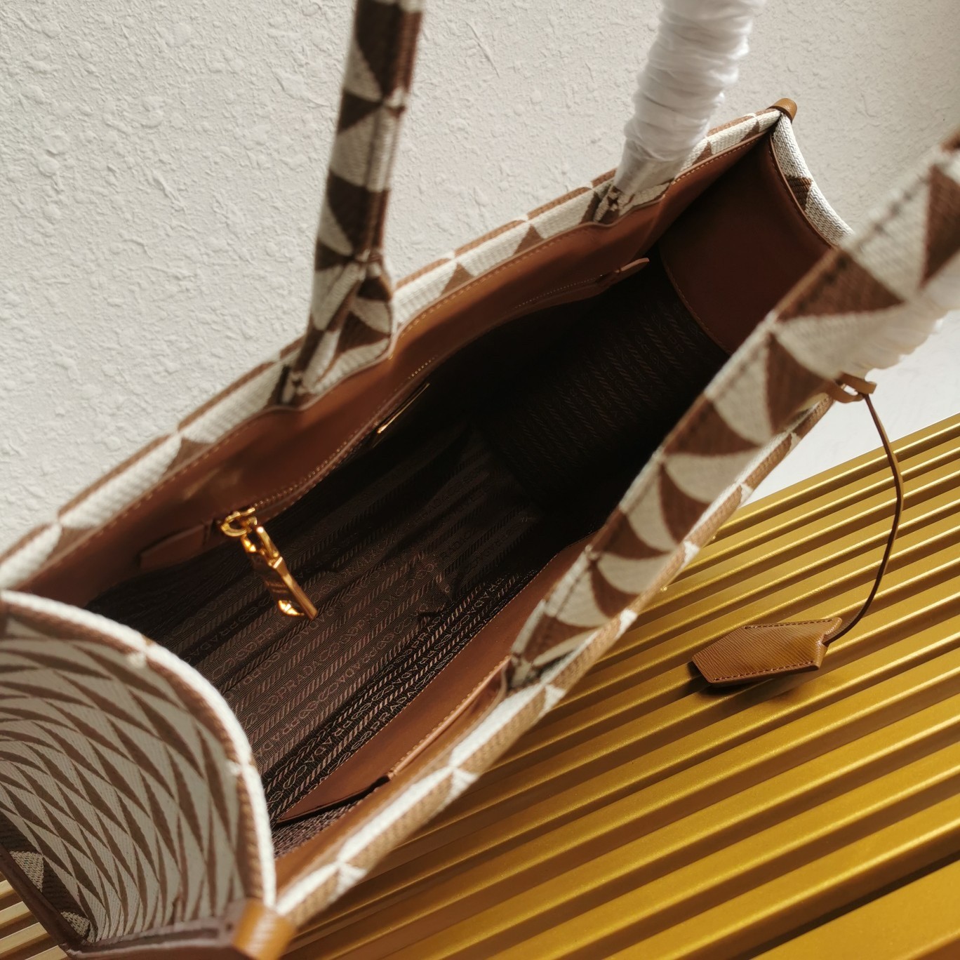 – Prada logo-print nylon lining with two pockets, one with zipper