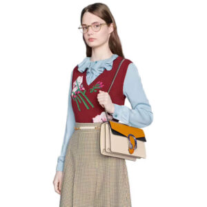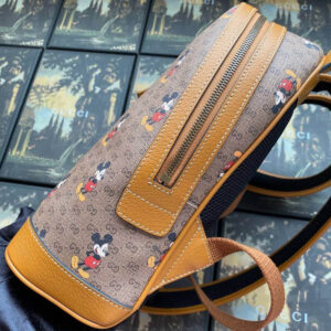 Mickey Mouse’s playful image defines this GG canvas backpack. trimmed with light brown leather details that convey a vintage lookand feel. In celebration of the Lunar New Year. Disney’s legendary character appears throughout Gucci’s ready-to-wear and accessories for the Cruise 2020 collection. displayed as colorful prints. embroidered patches or jacquard motifs.