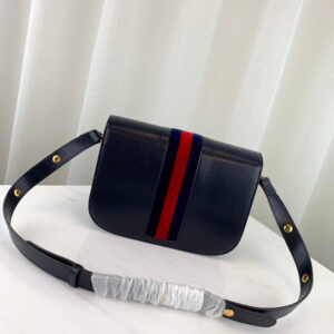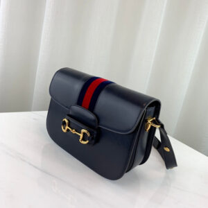 Introduced for Cruise 2020. the Gucci 1955 Horsebit bag is recreated from an archival design. With the same lines and forms first introduced over six decades ago. the accessory unifies the original details with a modern spirit. highlighting the Horsebit. Part of Gucci’s genetic code. the double ring and bar design has been established as one of the most distinctive elements among the House symbols borrowed from the equestrian world. Presented on a small flap shoulder bag. the hardware is paired with the House Web stripe on blue leather and completed with a special mechanism that adjusts the length of the shoulder strap so it can be carried on one shoulder or cross body.