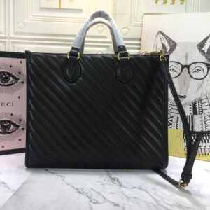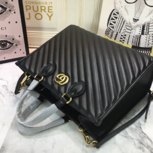 Introducing the Gucci AAA-Marmont medium tote bag. a stylish and practical addition to the GG Marmont line. Crafted from black matelass?? leather. this tote features antique gold-toned hardware and a microfiber lining with a suede-like finish. What sets this bag apart is its use of an alternative chrome-free tanning process. reducing its environmental footprint compared to traditional methods.