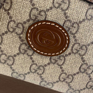 The Gucci Backpack with Interlocking G in GG Supreme 674147 is a vintage-inspired style that combines materials. colors. and House codes. The backpack is crafted from beige and ebony GG Supreme canvas. a material with low environmental impact. and features brown leather trim. The iconic Interlocking G logo is prominently displayed on an oval leather tag.