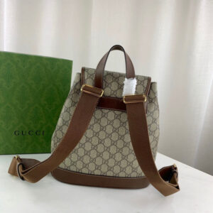 The backpack has a cotton linen lining and features one zip pocket and one open pocket inside. as well as a front zip pocket outside. The handle drop is 4.3″/11cm. and the backpack measures 10.4 W x 11.8 H x 5.1 D. This backpack is a stylish and practical accessory that showcases Gucci’s commitment to sustainability and heritage.
