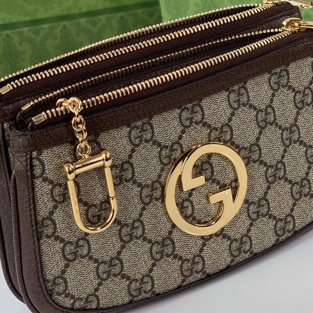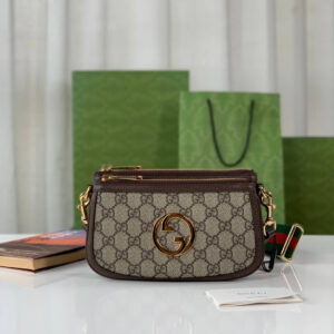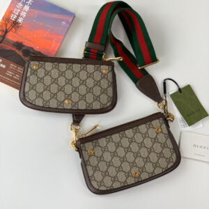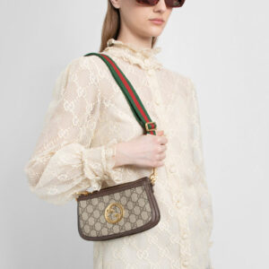 The Round Interlocking G emblem comes straight from the House archives. Emblems representative of Founder Guccio Gucci’s initials, have been reworked in a variety of forms and interpretations. Here it sits atop a beige and ebony GG Supreme canvas base, enriched with a green and red Web strap, resulting in a modern variation of a classic accessory.