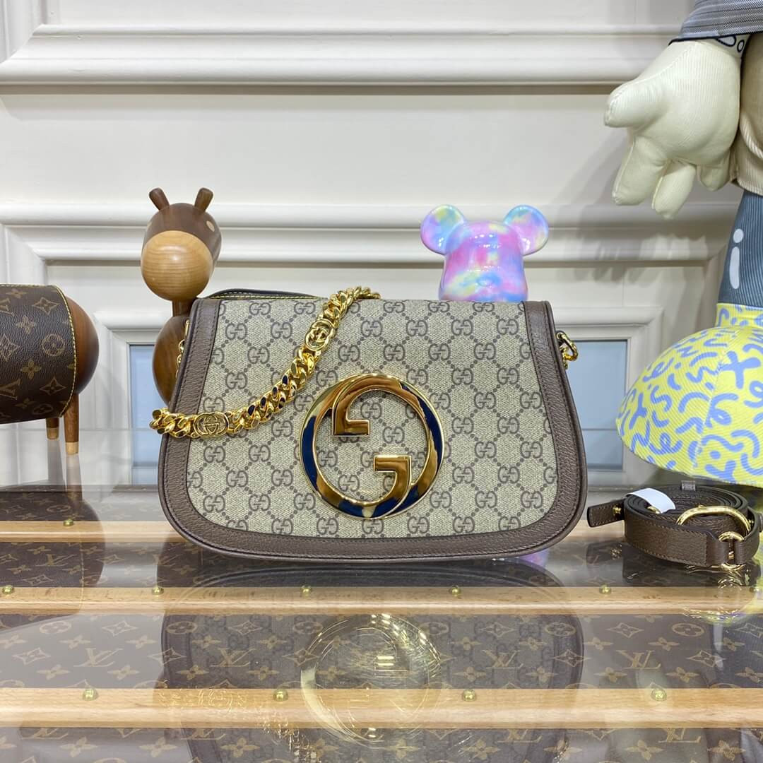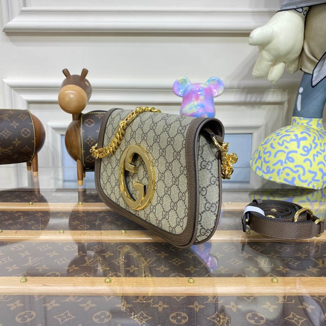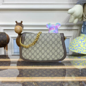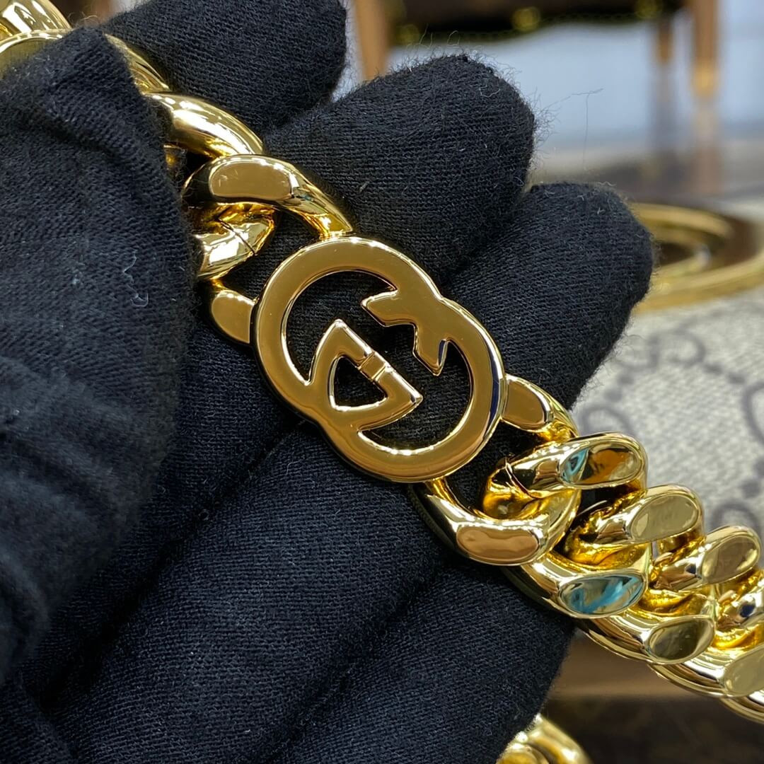 Vintage elements are paired with archival details as an ode to the glamour that permeated the Gucci Love Parade fashion show. This shoulder bag pairs a delicate chain strap with GG Supreme canvas to infuse the accessory with a timeless feel. Reintroduced in honor of the collection, the rounded silhouette is completed by a historical, rounded iteration of Guccio Gucci’s monogram.