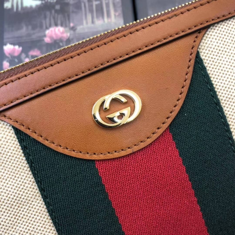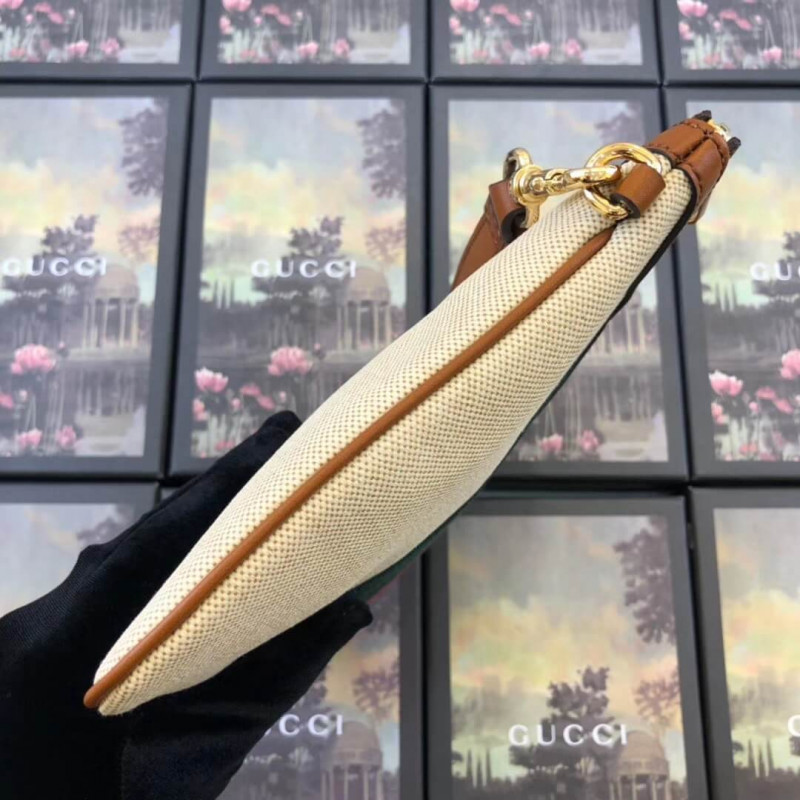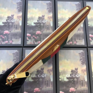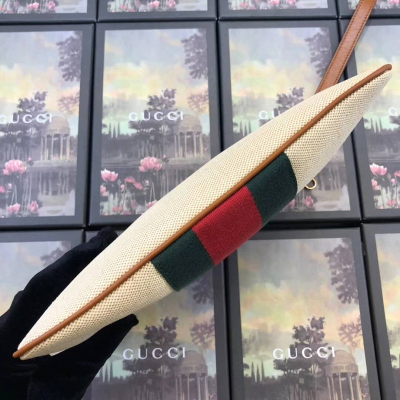 This stylish bag is crafted of beige canvas with a signature green and red canvas web stripe. and a gold interlocking GG logo on the front. The pouch features golden brown leather trim. and an optional. matching wristlet strap with gold hardware. The top zipper opens to a pale green fabric interior.