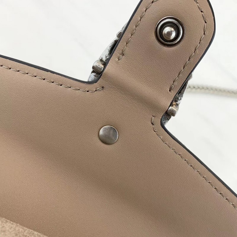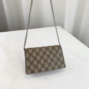A structured GG Supreme canvas chain super mini bag with a key ring that can be used to attach this bag to a separate larger bag. The closure has the textured tiger head spur closure-a unique detail referencing the Greek god Dionysus. who in myth is said to have crossed the river Tigris on a tiger sent to him by Zeus.