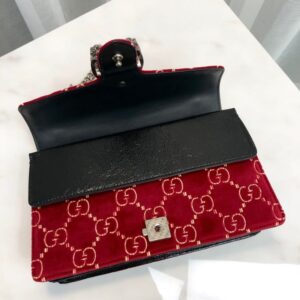 Made in GG velvet??an archival material with the GG motif embedded into soft velvet??the Dionysus shoulder bag continues to be a defining silhouette. The tiger head closure is a unique detail referencing the Greek god Dionysus. who in myth is said to have crossed the river Tigris on a tiger sent to him by Zeus. The sliding chain strap can be worn multiple ways. changing between a shoulder and a top handle bag.