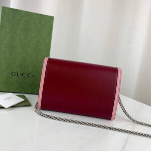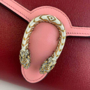 Signature styles from the Beloved lines are presented in vibrant colors that recall precious gems. Here the mini Dionysus is introduced in ruby toned red leather with a gold-toned take on its emblematic tiger head closure. The textured hardware is further enhanced by shiny enamel