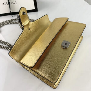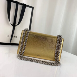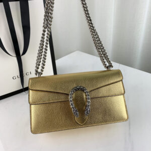 The Dionysus shoulder bag is presented in shiny silver leather. The now defining tiger head closure??a unique detail referencing the Greek god Dionysus. who in myth is said to have crossed the river Tigris on a tiger sent to him by Zeus??is further enhanced with sparkling crystals. The sliding chain strap can be worn multiple ways. changing between a shoulder. crossbody and a top handle bag.