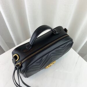 The GG Marmont shoulder bag has a softly structured shape with zip around closure and an oversized front flap with Double G hardware. The shoulder strap features the Sylvie Web stripe. an evolution of the Gucci Web in blue. red and white. Made in matelasse chevron leather with a heart on the back.