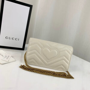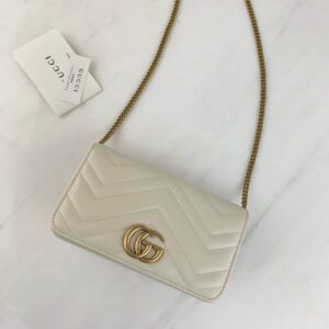 The GG Marmont chain mini bag has a softly structured shape and oversized flap closure with Double G hardware. The hardware is inspired by an archival design from the ’70s. Made in matelasse chevron leather.