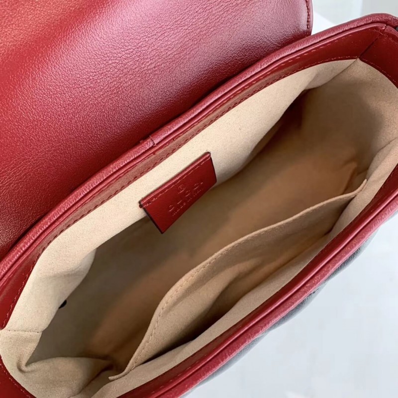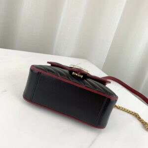 The GG Marmont bag is reimagined for Pre-Fall 2019. made from black diagonal matelasse quilted leather and completed with a twisted torchon Double G embellishment. The mini top handle’s distinct softly structured shape is outlined in contrast cerise piping. highlighting its oversized flap closure. A removable chain strap allows the satchel shape to also be worn as a shoulder bag.