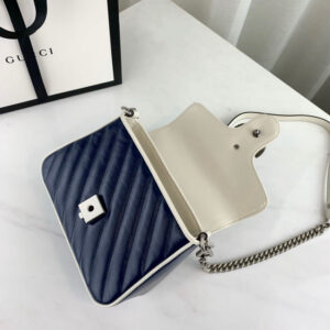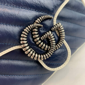 The GG Marmont bag introduced in blue for Cruise 2020. made from diagonal matelasse quilted leather and completed with a twisted torchon Double G embellishment. The mini top handle’s distinct softly structured shape is outlined in contrast white piping. highlighting its oversized flap closure. A removable chain strap allows the satchel shape to also be worn as a shoulder bag.