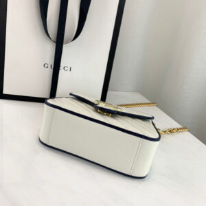 The Gucci GG Marmont Mini Top Handle Bag 583571 White is a stylish and versatile accessory that can be worn as a satchel or shoulder bag. It features a distinct softly structured shape that is outlined in contrast white piping. highlighting its oversized flap closure. The bag is made from white diagonal matelasse leather with a vintage effect and completed with a twisted torchon Double G embellishment. The antique silver-toned hardware adds a touch of elegance to the bag. The interior of the bag features a microfiber lining with a suede-like finish and an open pocket for storing small items. The bag comes with a detachable chain shoulder strap with a 21.9″ drop and a top handle with a 2.4″ drop. The bag measures 8.3 W x 6.1 H x 3.1 D. making it the perfect size for carrying your essentials.