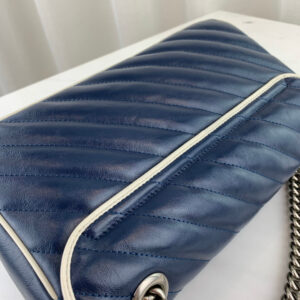 The GG Marmont bag is introduced in blue for Cruise 2020, made from diagonal matelassé quilted leather and completed with a twisted torchon Double G embellishment. The small chain shoulder bag’s distinct softly structured shape is outlined in contrast white piping, highlighting its flap closure. The sliding chain strap smoothly transforms from a single shoulder length to a doubled top handle length for multiple ways to wear the bag.
